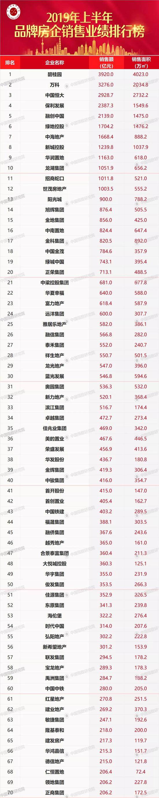2019年上半年品牌房企销售业绩排行榜