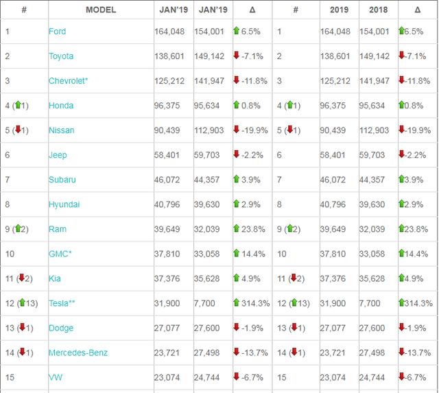 2019年1月中美汽车销量排行榜前15对比,差距最大的依旧是大众