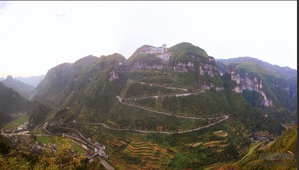 矮寨盘山公路,为国道319干线(旧称湘川公路)公路奇观。矮寨,位于湖南湘西土家族苗族自治州首府吉首市西20公里,湘川公路从寨中穿过,是一个风景美丽、古朴的苗乡集镇,为镇政府所在地。自下而上经13处弯道始达坡顶。山势陡峭险峻,近坡顶处有一公路天桥,全国罕见。山顶建有“湘川公路死事员工纪念碑”及“开路先锋”铜像。