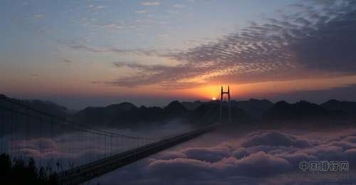 矮寨特大悬索桥,位于湖南湘西矮寨镇境内。矮寨悬索桥,距吉首市区约20公里,跨越矮寨镇附近的山谷,德夯河流经谷底,桥面设计标高与地面高差达330米左右。桥型方案为钢桁加劲梁单跨悬索桥,全长1073.65m,悬索桥的主跨为1176m。该桥跨越矮寨大峡谷,主跨居世界第三、亚洲第一。工程计划投入7.2亿元,占吉茶高速公路计划总投资的15%。2012年3月底,创4项世界第一的湖南矮寨特大悬索桥正式通车。