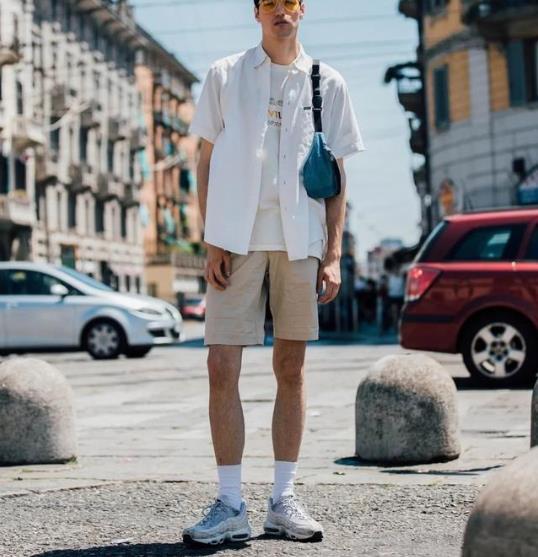 白色的短袖衬衫搭配黑色的短裤就给人一种简约又休闲的感觉,如果你想要走运动休闲风,配上一双亮眼的运动鞋是再合适不过了,还给整体的穿搭增加了一种活泼潮流的感觉,这样简单又不失潮流感的穿搭对于男孩子来讲简直太可了。
