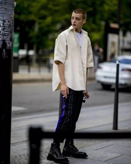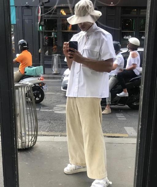 刚才街头君讲的都是偏成熟男士的穿搭,如果想要让短袖白色衬衫穿得更为活泼一点,那么一条宽松范的浅色休闲裤是再合适不过了,搭配一顶浅色渔夫帽那种青春活力感更甚了,满满的潮流味啊,