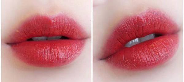 盒面是雾面,颜色相对深邃迷醉,质感深沉,彰显气质,持久度相对好一些,妆感也更加有气场!哑光质地偏干,比滋润版显色度会好一些,上色效果也好。不过要说哑光的最大的优点就是持久度超强,喝水吃饭不沾杯,不用补色。