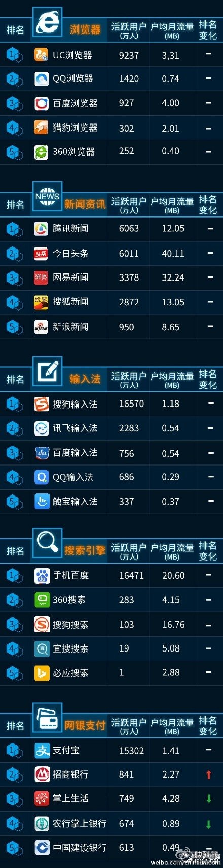 新榜单还将之前的“即时通讯”和“社交”两大分类进行了合并,原先遥远领先的微博直接被新加入的微信、QQ碾压,用户活跃只有对手的1/6。
